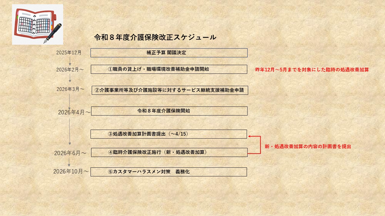 速報!令和8年度介護保険改正の概要 2026年2月25日 | by carematchmaster BLOG 4月より1部改正し施行される令和8年度介護保険改正。 その全体スケジュールを掲載。 申請が開始された「賃金・職場環境改善補助金」、それに続く「サービス支援継続補助金」など申請期限があるものは確実にチェックを!